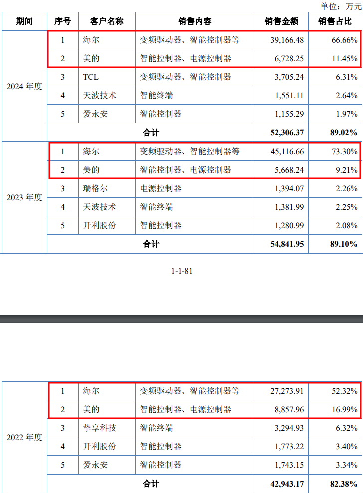 尚研科技在招股书中提及客户集中度较高及单一客户依赖风险。报告期内,公司对前五名客户合计销售额占当期营业收入的比例分别为82.38%、89.10%及89.02%,客户集中度较高,其中对第一大客户海尔的收入占比分别为52.32%、73.30%及66.66%。报告期内,海尔、美的始终为公司前两大客户。