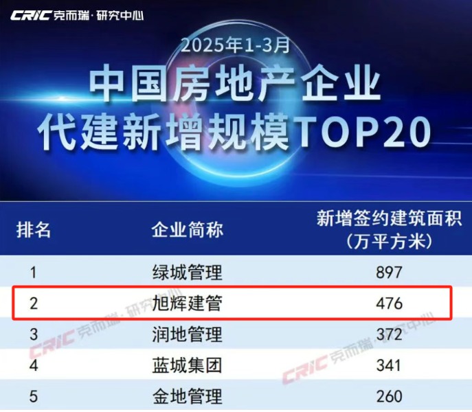 数据显示七星,2025年一季度,旭辉建管新增在管项目数量28个,同比增长47%;截至一季度末,公司在管面积达3500万平方米,较2024年底增长约17%;累计在管项目超200个,累计项目覆盖城市数量75个。